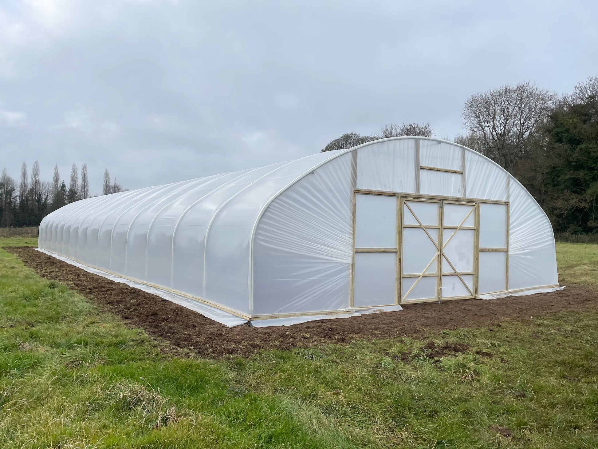 Supplied as standard with an outer and inner timber door frame, with double hinged doors at each end of the polytunnel. The door opening is 8ft wide, and the doors and side panels are covered with polythene.
